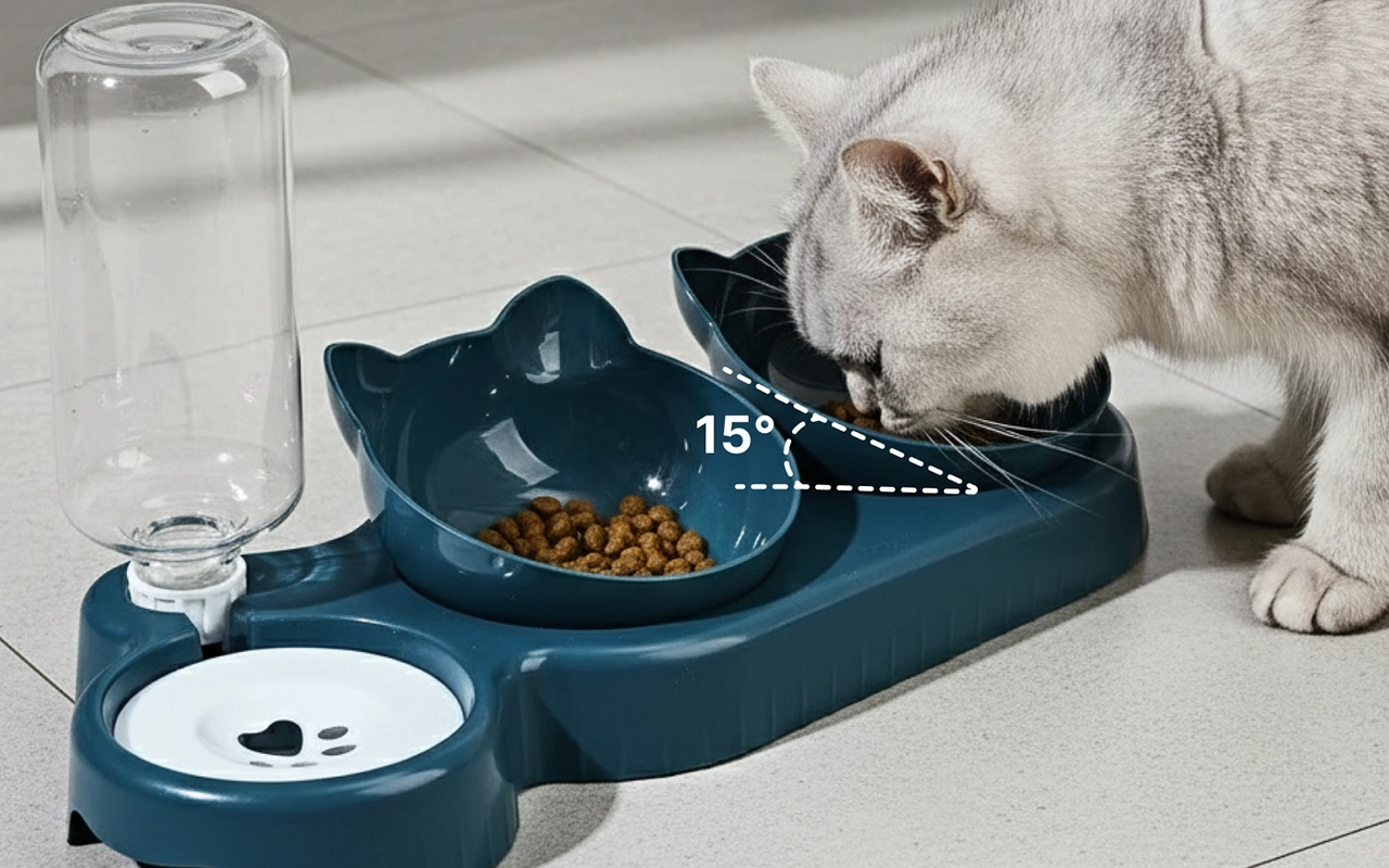 Los cuencos inclinados realmente ayudan mucho a mi gato mayor. Ya no hay más estornudos de agua por todos lados. Fácil de limpiar y rellenar, incluso para mis hijos.