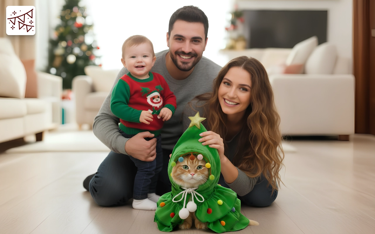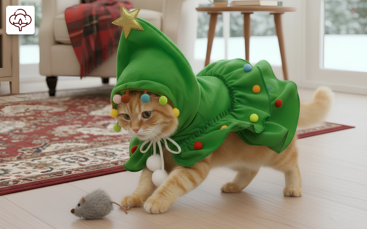 ¡Súper festivo y cómodo para mi gato! Corrió y jugó con él sin problemas. Se lavó bien después de un desastre navideño. Muchas risas de todos.
