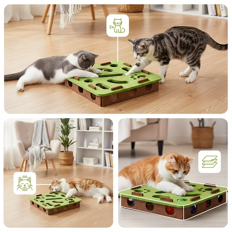 Nuestro juguete de ejercicio combina rascar, perseguir y esconderse en un solo lugar. Cada sesión ofrece oportunidades únicas para que las mascotas se muevan y exploren.
