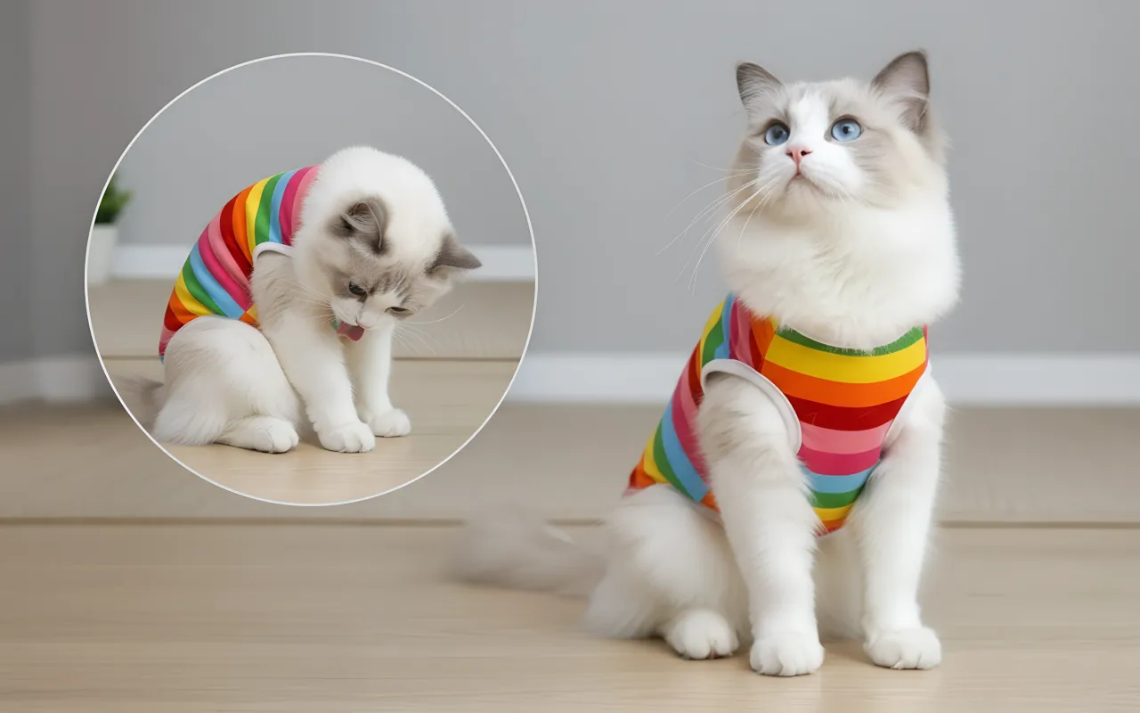 El traje de esterilización para gatos Primdog protege las heridas del lamido o mordedura. Se ajusta cómodamente, permitiendo que los movimientos sean naturales durante la recuperación.