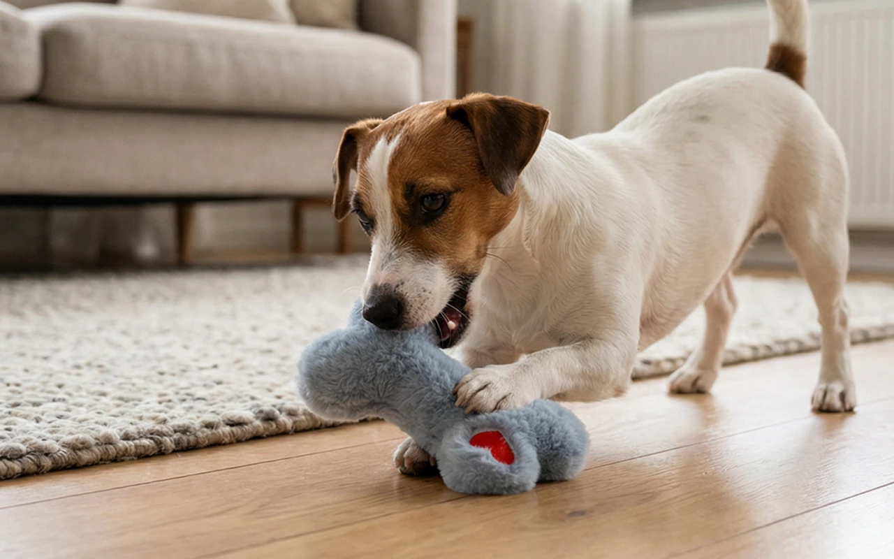 A mi perra le encanta acurrucarse con su hueso de peluche después de jugar. Le ayuda a calmarse por la noche y ya no le interesa morder los muebles.