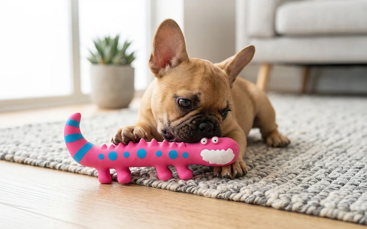 Compré este lindo juguete de lagartija para masticar para mi perro y al instante se convirtió en su favorito El sonido al apretarlo lo mantiene ocupado y fuera de problemas durante horas.