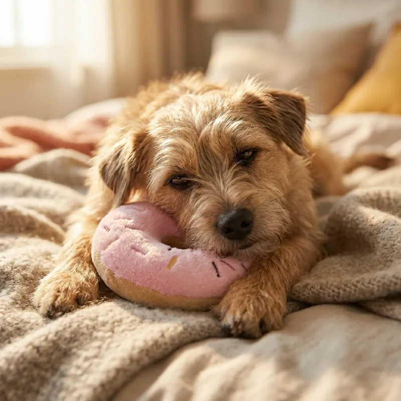 Mi perrita rescatada se pone nerviosa con los juguetes nuevos, pero esta dona suave la conquistó en cuestión de minutos. La mastica con cuidado, la hace chirriar y luego la usa como almohada.