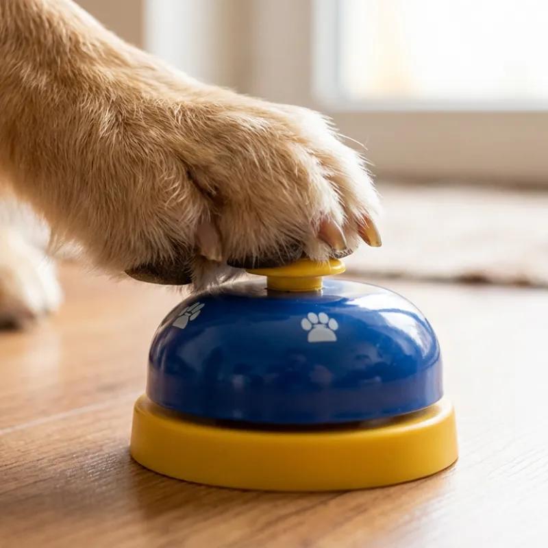 Compré la campanilla para mi perro mayor con artritis. Un toque suave es suficiente, así que puede pedir comida o salir sin pasearse ni rascar la puerta.