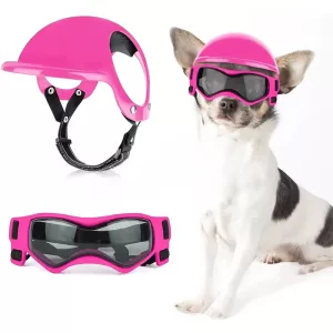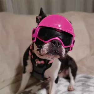 Nuestro casco y gafas para perro están diseñados con correas en la barbilla y la cabeza. Se ajustarán perfectamente y permanecerán en su lugar durante los paseos.