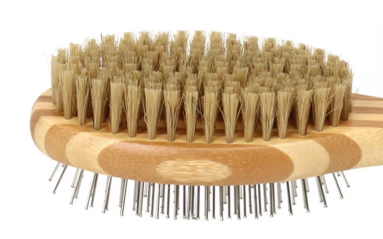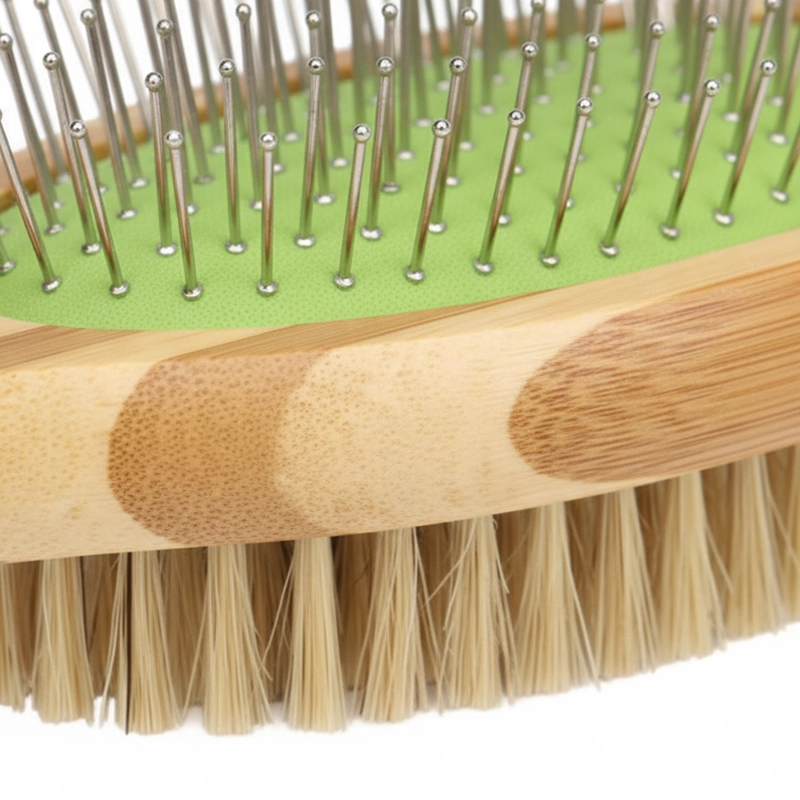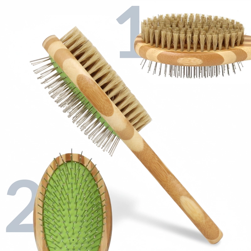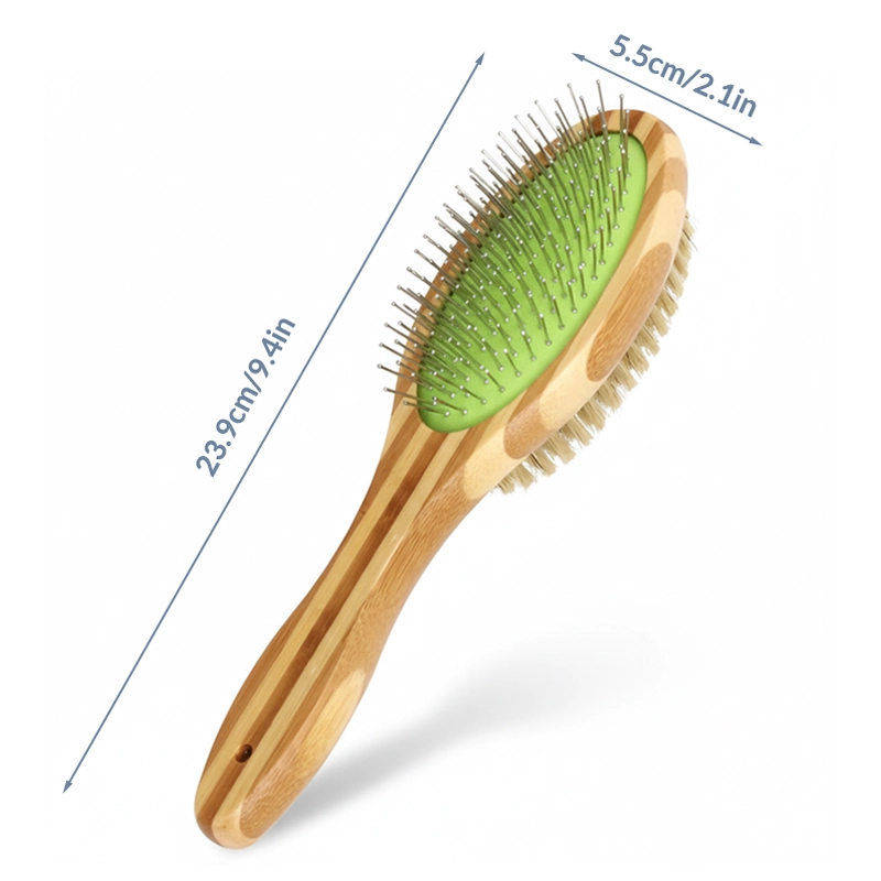 Cambia fácilmente entre el lado de cerdas y el de púas para un cuidado completo. Cada lado elimina enredos suaviza el pelaje para un acabado pulido.