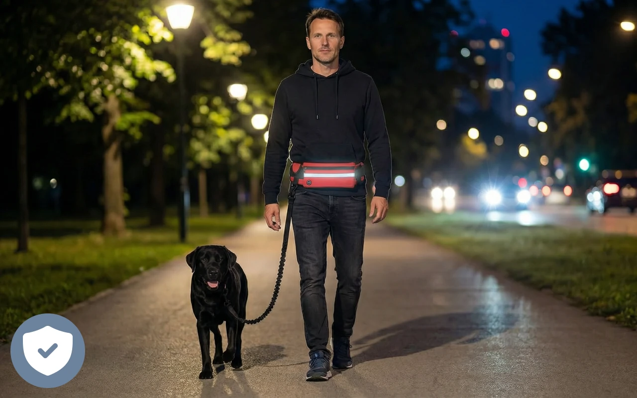 Genial para paseos después de cenar. La cinta refleja la luz de los autos, y mis cosas están seguras en la riñonera.