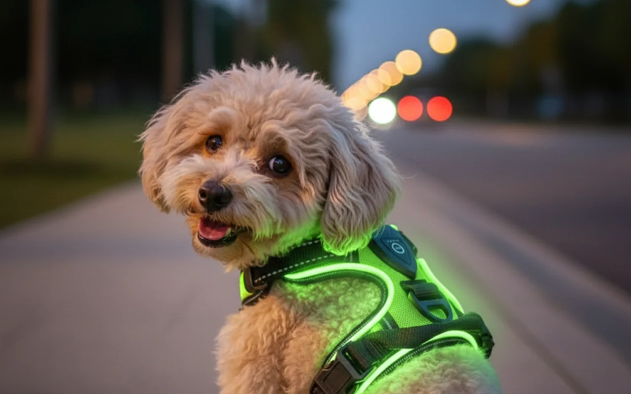 Me encanta lo visible que está Spike ahora. Las luces brillantes y las correas suaves lo mantienen feliz durante las carreras nocturnas. También se siente muy seguro.