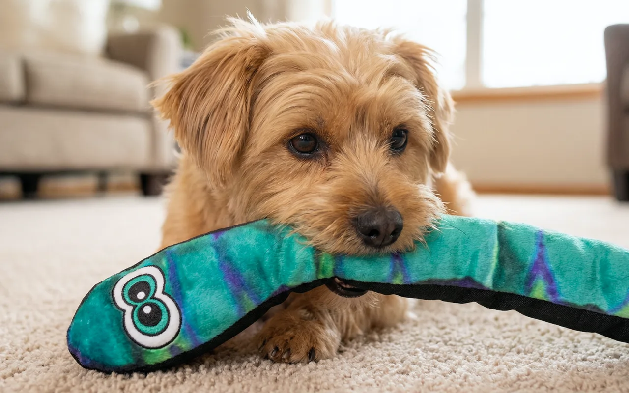 Mi cachorro se emociona apenas ve la serpiente colorida. El material es suave para sus dientes y juega durante horas sin aburrirse.