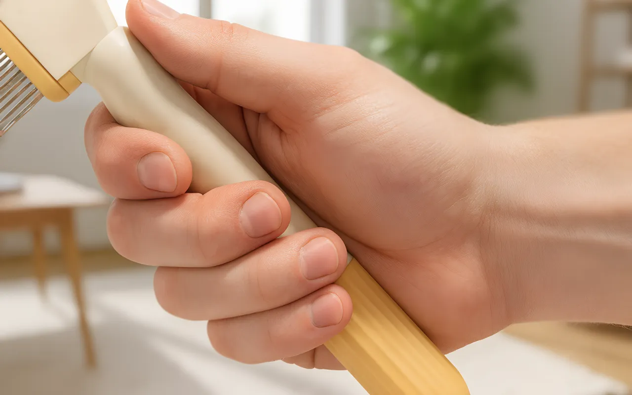 ¡Muy fácil de usar! Lo sostengo cómodamente y nunca se me resbala de la mano. El pelaje de mi gata se ve mucho más brillante después de cepillarla. Lo recomiendo mucho.
