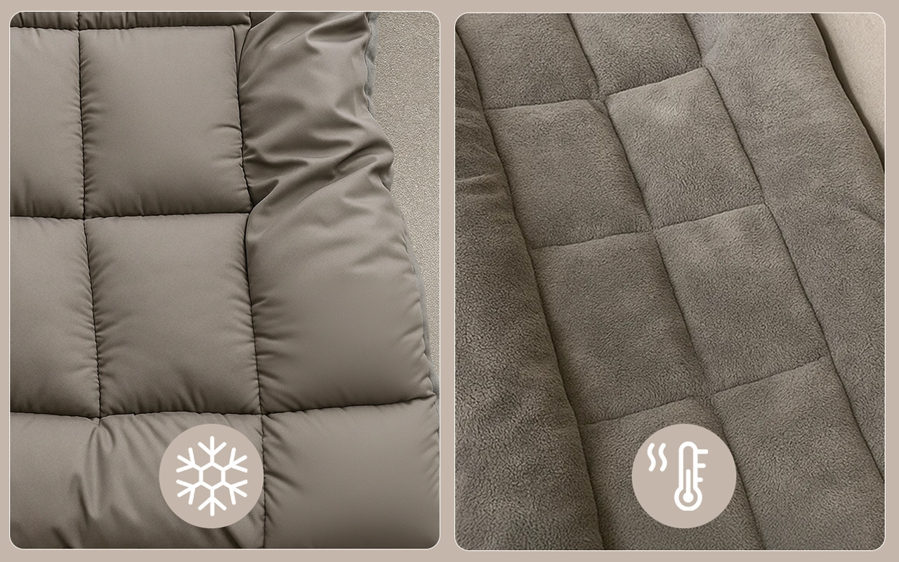 Un lado mantiene la frescura durante los meses cálidos. Da la vuelta para una superficie acogedora cuando llega el invierno en casa.