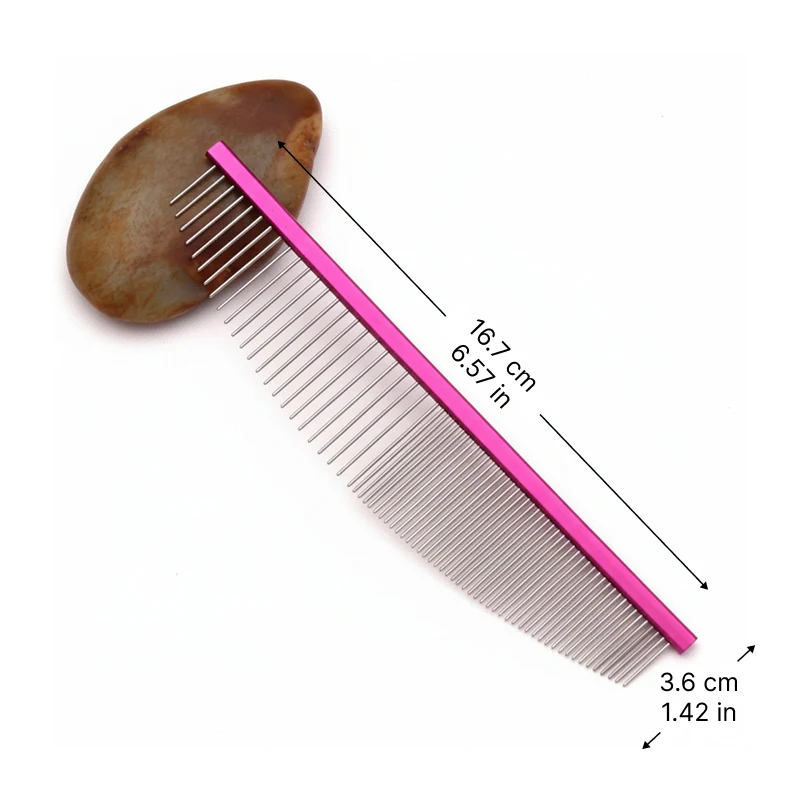 El mango es cómodo y el peine de acero funciona en mi gato de pelo largo y mi perrito. Ya no hay zonas sin peinar en su pelaje.
