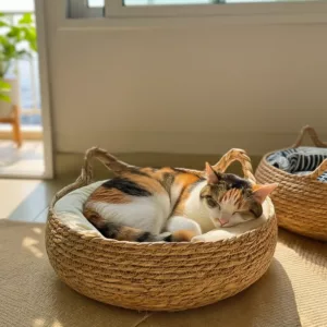 Mi gato se acurruca en este nido cada noche. Súper fácil de limpiar y el diseño tejido le da un toque único a mi casa.
