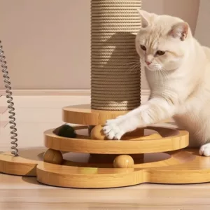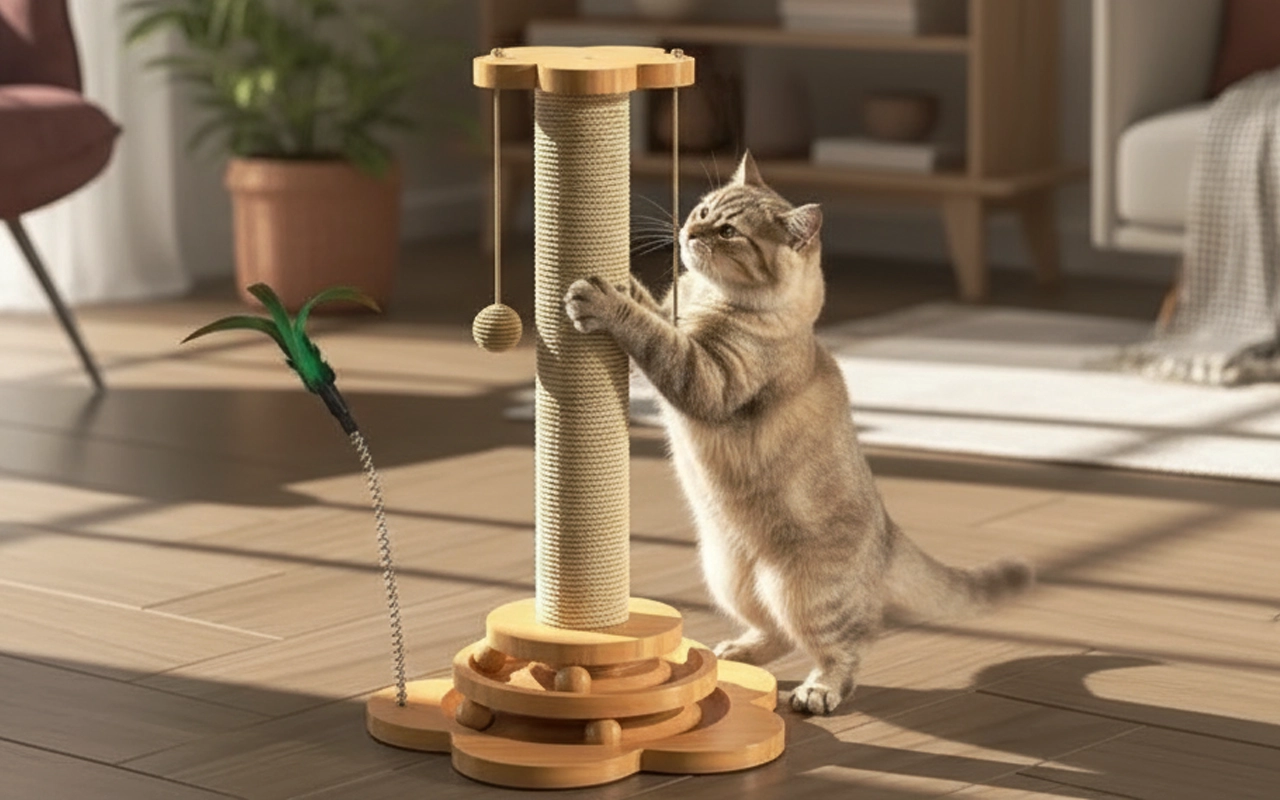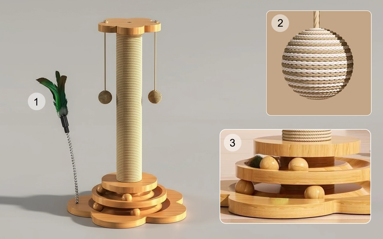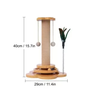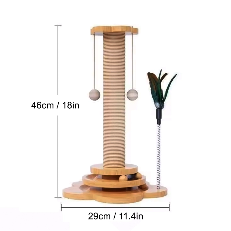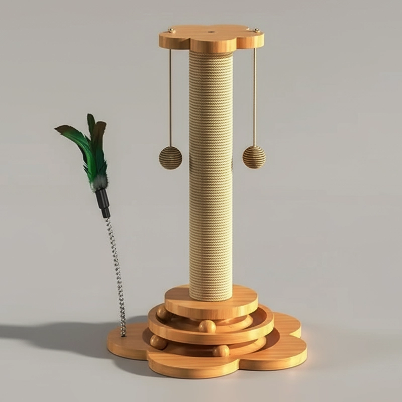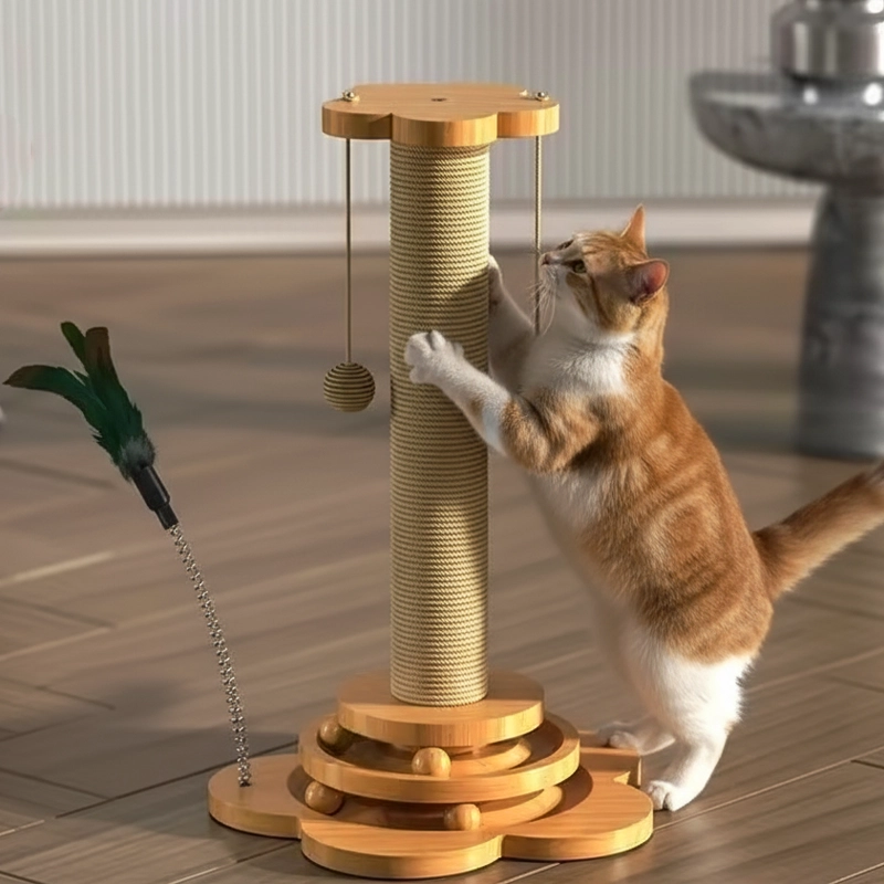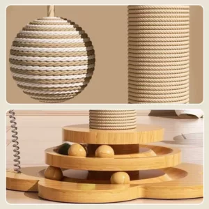 Poste rascador de madera y sisal para gatos con bolas colgantes